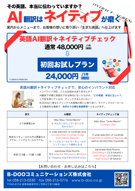 英語AI翻訳+ネイティブチェック 製品・サービス名 英語AI翻訳+ネイティブチェック 主な内容 AIで英語に翻訳されたメニュー/案内/看板などを、ネイティブスピーカーが丁寧にチェックし、自然な英語に仕上げるサービス。 製品・サービス 地域貢献活動 事業 地元企業/産業支援 メニューや看板の英語、「ちゃんと通じてる?」と不安になりませんか? AI翻訳にネイティブの目線をプラス!自信を持っておもてなしできるようにお手伝いいたします。 一覧へ戻る 関連記事 2026.03.18 B-DOOの学会支援プログラム 2026.03.18 B-DOO生成AI導入支援サービス 2026.03.18 B-DOO生成AIラボ